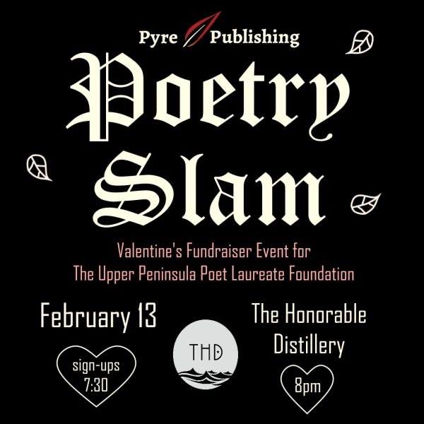 The Honorable Distillery 136 W. Washington St. Signup 7:30 pm Competition 8:00 pm Tell us about love or lack of love. Bring on your words! See rules below. Prizes for winners. Cheer on your favorites. Bring home bouquets with a donation to the U.P. Poet Laureate Foundation.