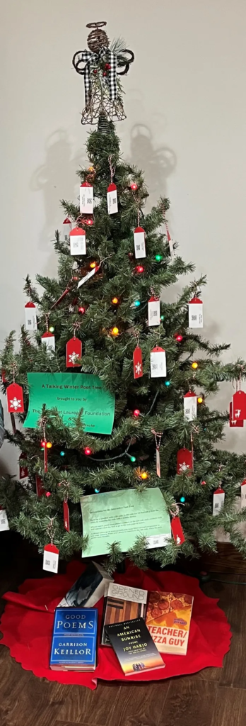 Dec. 2021 U.P. Poet Laureate M. Bartley Seigel and previous laureates: Martin Achatz and Andrea Scarpino joined the Marquette Poets Circle by sharing poems on a “Talking Winter Poet Tree” at Peter White Library’s Winter Wonderland. Visitors to the tree could scan red tags and hear the poets read their poems.